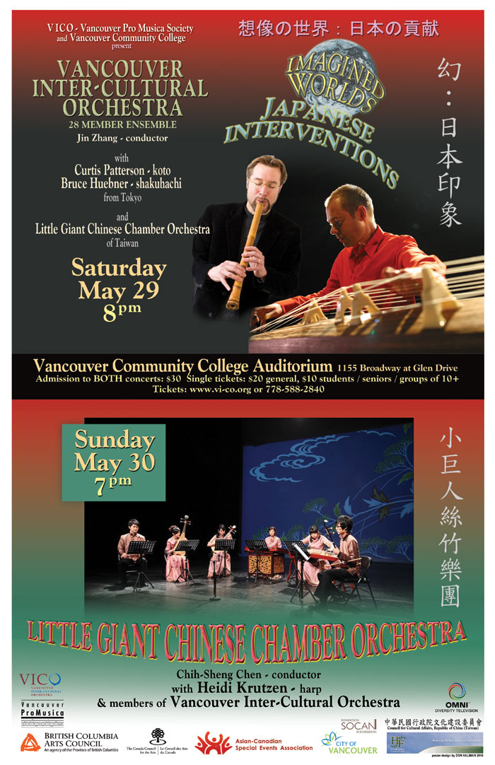 The Vancouver Inter-Cultural Orchestra (VICO) welcomes internationally acclaimed guest musicians from Japan and Taiwan for two major concerts over the last weekend in May (Asian Heritage Month in Vancouver). This is fusion music on a grand scale, collaborative art that breathes new life into centuries-old sounds from all over the world, creating global music for a global stage.