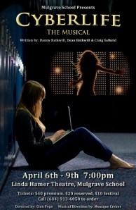 Cyberlife is an original commission with a twist: many of the students who are participating as cast and crew have been involved from the very beginning of the creation process. This past fall, before a single note or line of dialogue had been written, the creative team – composed of Danny Balkwill, Dean Balkwill and Craig Salkeld (professional performers, writers and musicians whose credits include Mirvish Theatres’ The Lion King and We Will Rock You, national tours of Tommy and Mamma Mia, and the Broadway production of Rent) – ran a workshop at the school, during which musical theatre students bounced ideas around, discussing themes and characters and possible storylines. The writers took those ideas away and turned them into Cyberlife, a musical uniquely tailored to the interests and talents of the students who will perform it. Visit www.mulgrave.com for more background, photos and video clips from rehearsals.