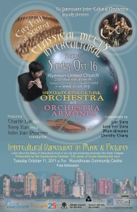 In the second event of the Vancouver Inter-Cultural Orchestra’s “City Full of Sound” series, VICO musicians Yun Song (erhu), Charlie Lui (dizi), Yu-Chen Wang (zheng), Lan Tung (erhu) and Jonathan Bernard (percussion) will join acclaimed string ensemble Orchestra Armonia for an innovative evening of classical music with an intercultural slant. The programme will include pieces by Vancouver composers Mark Armanini, Jung Sen Tung, Dorothy Chang and Lan Tung.